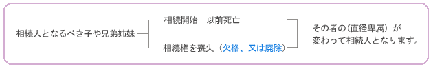 代襲相続ってなに? ![]() 欠格とは ? 被相続人又は先順位相続人の殺害を計ったり、被相続人を脅迫して遺言の書き換えをした場合等は相続人になることができません(民法第891条)。 廃除(家庭裁判所の審判が必要となります。)とは ? 相続人となるであろう者が被相続人に対し、虐待、重大な侮辱、著しい非行があったとき、被相続人は家庭裁判所への申し立て、又は遺言(被相続人の遺言に基づき遺言執行者が家庭裁判所に申し立てを行います。)にてその者の相続資格を剥奪することができます。